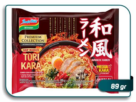 Indomie Premium Collection Tori Kara Ramen: Ramen dengan tekstur mi bulat tebal yang berpadu dengan kuah kental ramen yang gurih pedas membara,aroma wijen yang nikmat dan topping rumput laut serta sesame seeds,memberikan kepuasan maksimal bagi pencinta ramen otentik Jepang dengan rasa pedas. Pedesnya Jepang Banget!